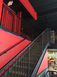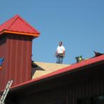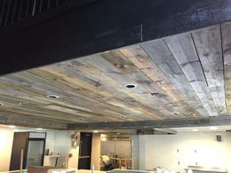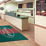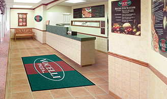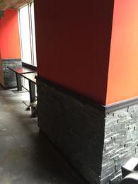 Vocelli Pizza’s walls are “dressed up” with high-quality vinyl covering above an oak chair-rail with faux 6''x 6'' natural stone porcelain tile below. The floor is a faux 12'' x 12'' natural stone textured porcelain tile. An oak crown molding and corner blocks are used at the top of the walls and the pick-up window is framed in oak as well. All of the oak is stained with classic cherry and coated with semi-gloss polyurethane for durability. An archway over the customer counter adds visual interest.